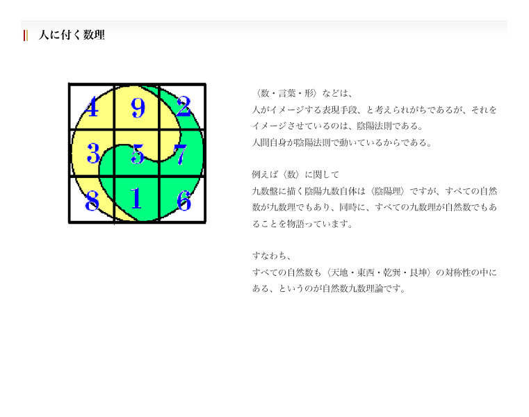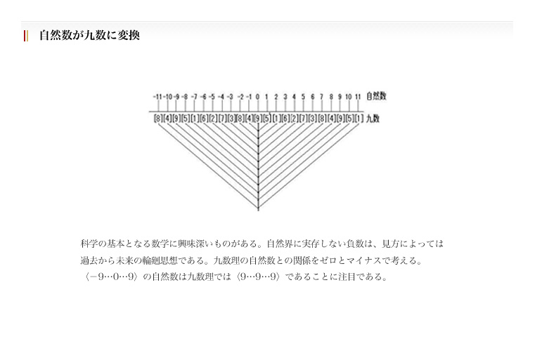 現代数学の取り扱う〈数〉は、「陰陽対称性の意味」をも包含している、それに現代数学が気付かぬだけである。 全自然数は九数理を根源として表れ出ているから、自ずと、九数に全変換することができる。